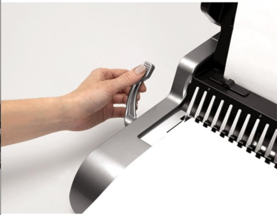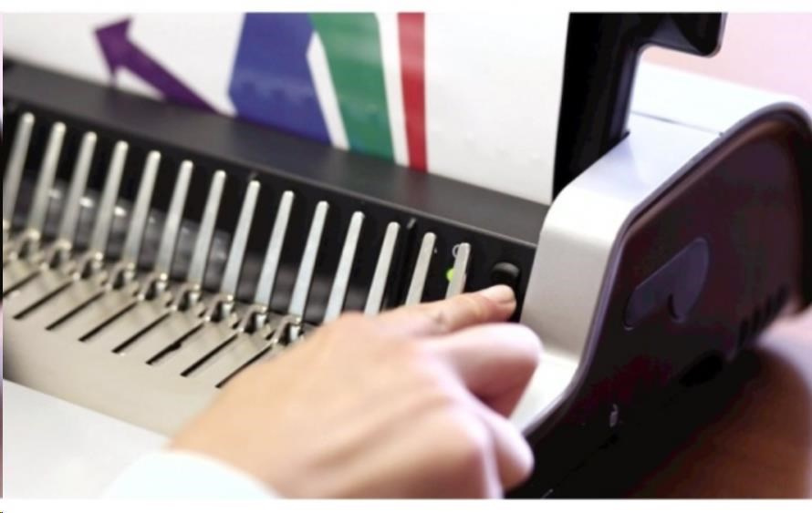 Stroj je vybaven větším zásobníkem na uložení několika plastových hřbetů a integrovanou měrkou pro správnou volbu průměru hřbetu.