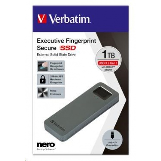 VERBATIM externí SSD 1TB, Executive Fingerprint Secure SSD, USB 3.2 Gen 1/USB-C, (W:356 MB/s, R:344 MB/s), šedá