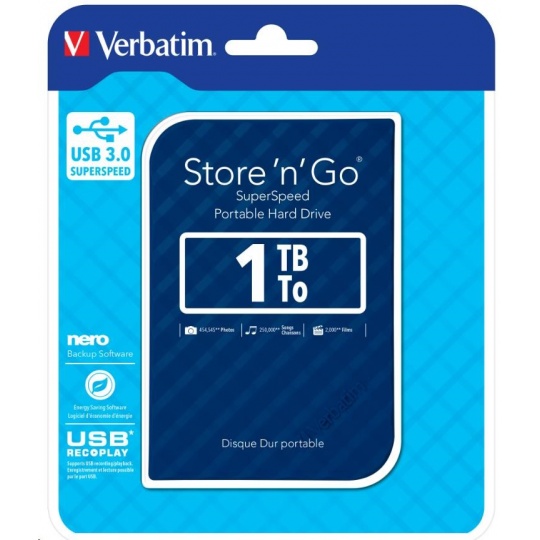 VERBATIM HDD 2.5" 1TB Store 'n' Go Portable Hard Drive USB 3.0, Blue Special Features: Colours available: Black, Silver, White, Red & Blue Capacities available: 500GB, 1TB & 2TB High speed, high capacity storage. A fast & safe solution to expand storage or backup files USB 3.0 SuperSpeed - for ultra fast data transfer Nero Backup Software Energy Saving Software USB REC & PLAY* - supports USB recording/ playback 2 year limited warranty** System requirements: PC or Mac with USB 3.0 Windows XP / Vista / Windows 7 & 8 Mac OS X 10.4 or higher Pack Contents: Portable Hard Drive / USB 3.0 Cable / Nero Backup Software / Green Button Energy Saving Software / Verbatim Formatter / Quick Start Guide / User Guide (pre-loaded on the drive).