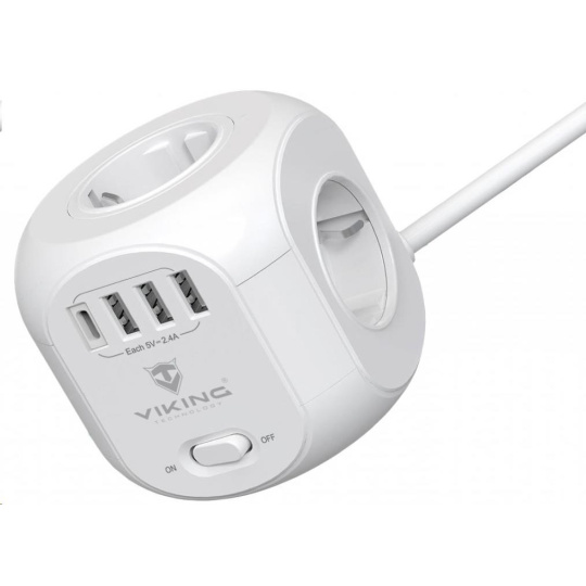 Síťový adaptér Viking AC Cube je praktickou kombinací čtyř zásuvek, čtyř USB portů a 1,8 m prodlužovacího kabelu v jednom, který šetří místo a umožňuje napájení až 8 zařízení současně.