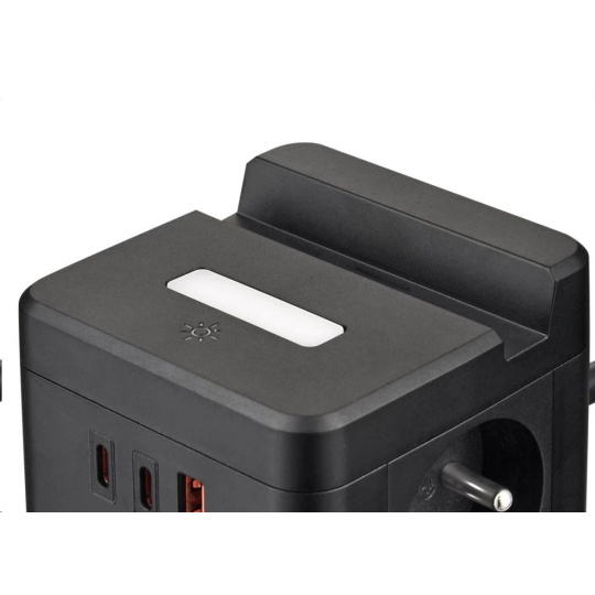 Viking síťový adaptér YC23H, 2x 230 V, 1x USB-A, 2x USB-C, dotykové světlo, funkce stojánku, černá