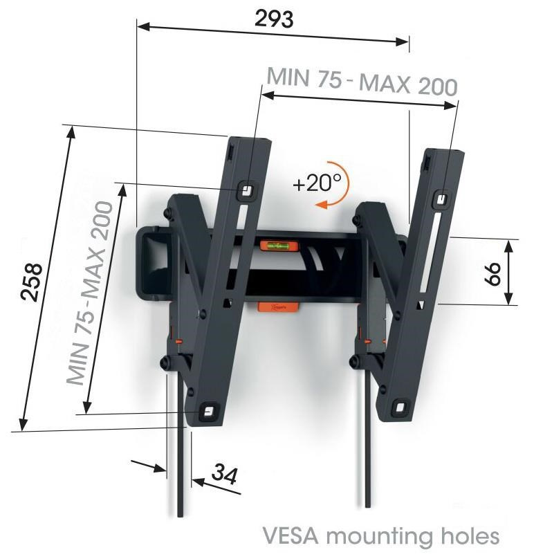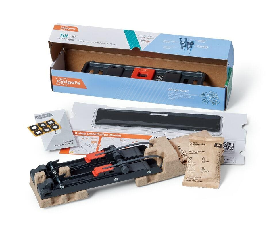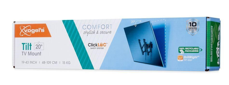 S nástěnným držákem TVM 3213 řady COMFORT Tilt volíte styl, bezpečnost a příjemný zážitek ze sledování. Nástěnný držák je ideální pro případy, kdy je televizor umístěn na stěně o něco výše, například v ložnici. Můžete jej naklonit až o 20° a vytvořit si tak ideální pozorovací úhel. Nástěnný držák je vhodný pro televizory s úhlopříčkou od 19 do 43 palců a hmotností do 15 kg. Televizor si skutečně užijete, teprve když jste si jisti, že je pěkně a bezpečně namontován. Stylový držák TVM 3213 vám tuto jistotu poskytne. Nástěnný držák je navržen a vyroben pro dlouholeté intenzivní používání.