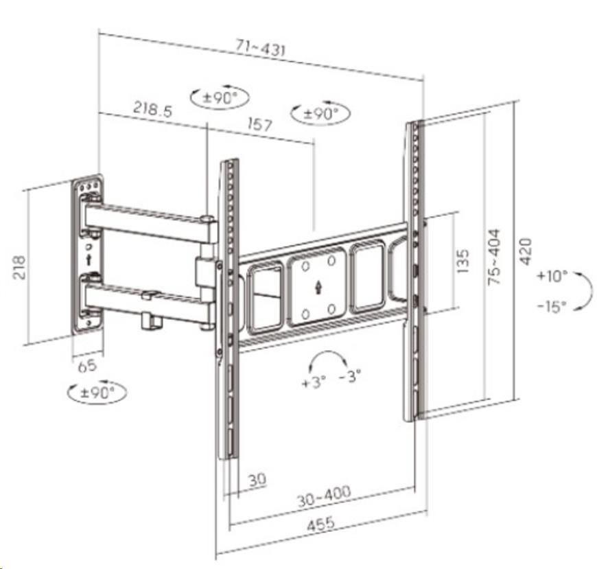 • Výsuvná konstrukce s možností stranového natočení v rozsahu +90°~-90°