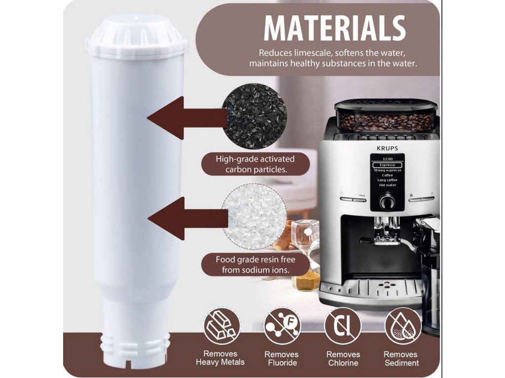 - Jednoduchá instalace: Filtr je navržen tak, aby byl snadno vyměnitelný a kompatibilní s většinou plnoautomatických kávovarů Krups.