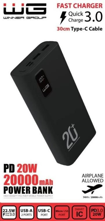 WG - Power Bank 20000 mAh, USB-C PD 20W + USB-A QC 3.0 22.5W, černá