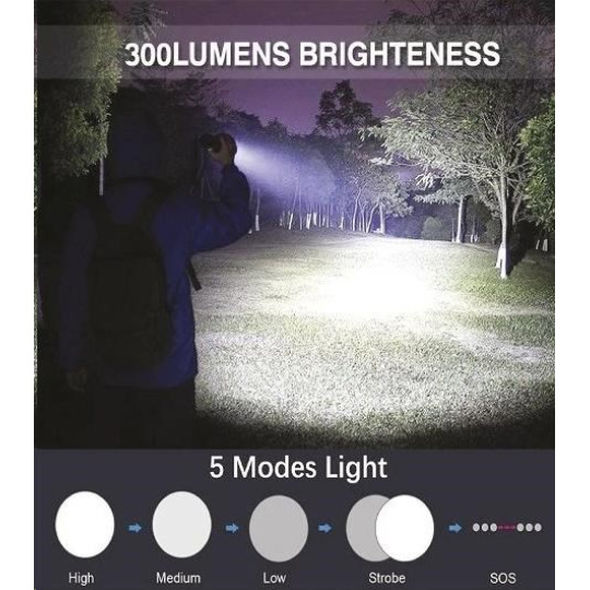 Funkce svícení: 3 úrovně světla (silné, střední, slabé), blikání, SOS.