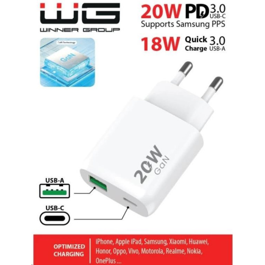 WG - Síťová nabíječka 2x USB, 1x USB-C PD 20W + 1x USB-A QC3.0 18W, white
