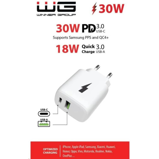 WG - Síťová nabíječka 2x USB, 1x USB-C PD PPS 3.0 30W + 1x USB-A QC4 18W, white