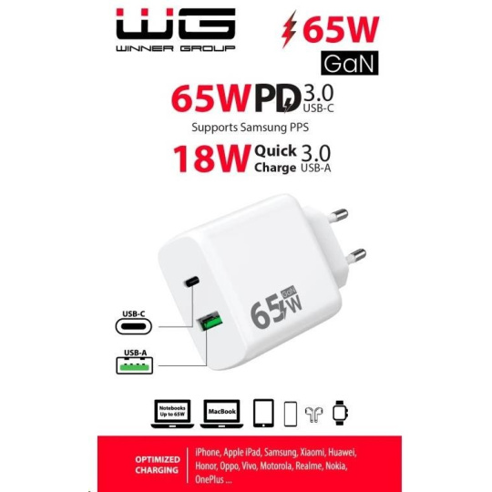 WG - Síťová nabíječka GaN 2x USB 65W, 1x USB-C PD 65W + 1x USB-A QC3.0 18W, white