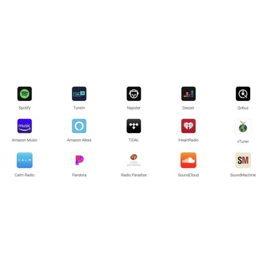 Hudební služby v aplikaci: Spotify, Amazon Music, Deezer, Tunein, Tidal, Qobuz, iHeartRadio, Napster, Sound machine etc.