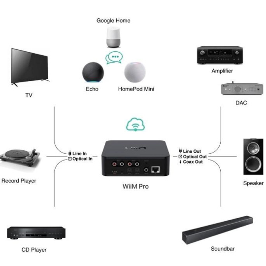 WiiM Pro podporuje studiovou kvalitu zvuku až do rozlišení 192 kHz 24bitů. Kvalitní integrovaný D/A převodník umožňuje díky osazeným RCA výstupům vytvořit moderní audio sestavu s jakýmkoliv zesilovačem. WiiM Pro navíc disponuje digitálním optickým i analogovým RCA vstupem pro připojení externích přehrávačů čímž vytvoří moderní audio centrálu.