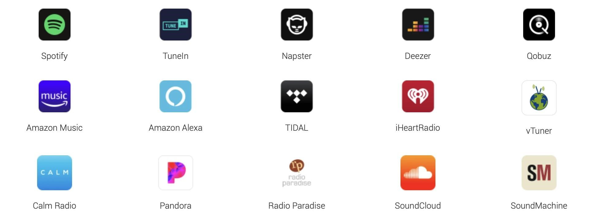Hudební služby v aplikaci: Spotify, Amazon Music, Deezer, Tunein, Tidal, Qobuz, iHeartRadio, Napster, Sound machine etc.