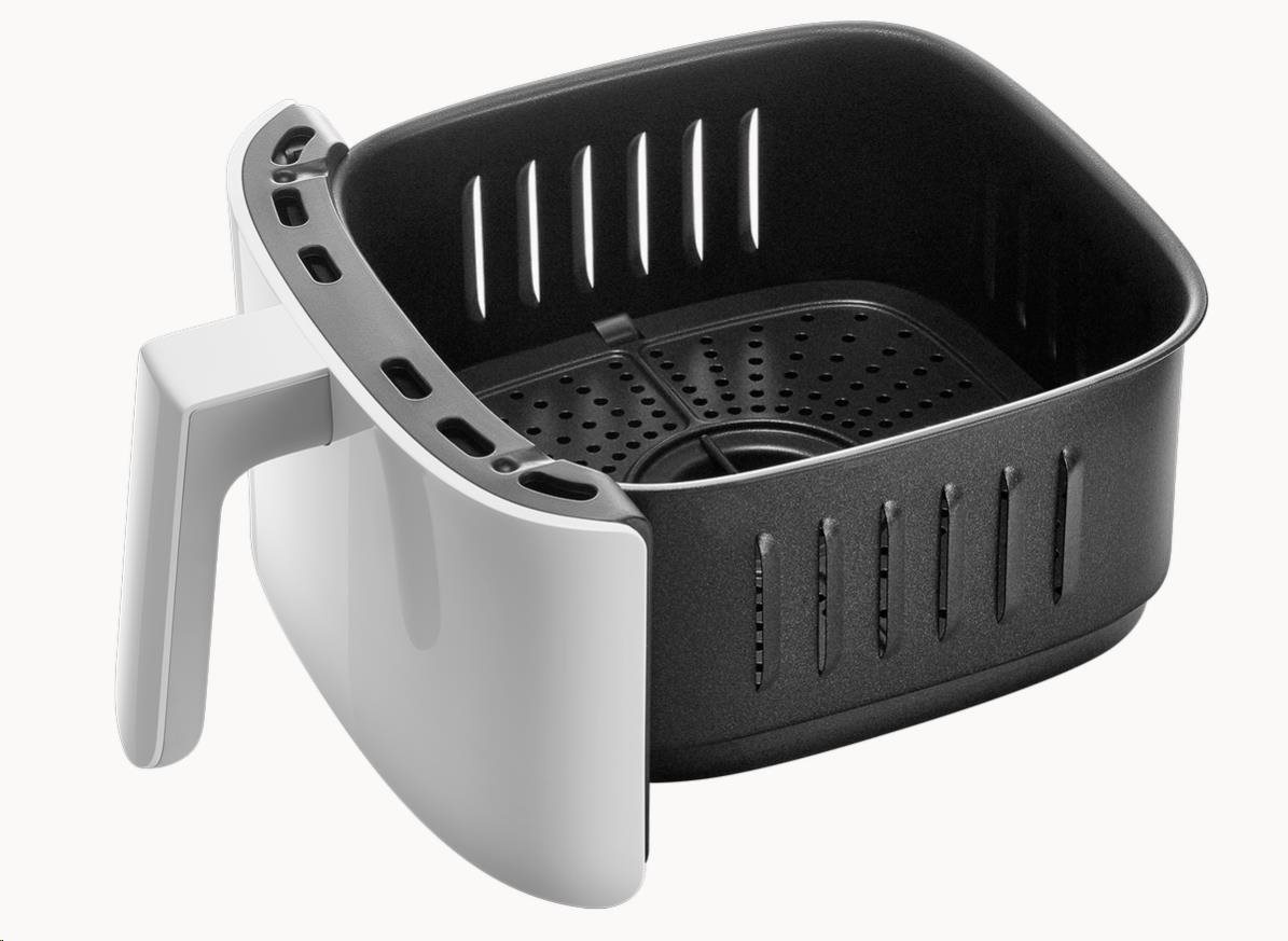 Olej uvnitř jídla je důkladně smažen 360 ° cirkulací ohřátého vzduchu a poskytuje lahodné jídlo s menším množstvím tuku. Vysokorychlostní cirkulace tepelného proudu zajišťuje rovnoměrné ohřívání pokrmů, vytváří křupavou vnější vrstvu a vnitřek zůstává měkký. Po dokončení vaření je olej filtrovaný z jídla jasně vidět na dně koše a jídlo chutná stejně, jako by bylo smažené na oleji. Jídlo je tak chutné a navíc s nízkým obsahem tuku!