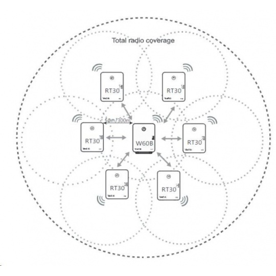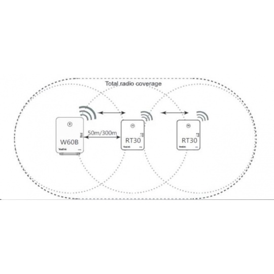 Repeater je vhodný pro rozšíření pokrytí stávající či nové DECT sítě. K jedné základně může být připojeno až 6 repeaterů a ve spojení s W60B podporuje kaskádování dvou RT30. Na repeateru je možné uskutrečnit 2 souběžné hovory. Repeater Yealink RT30 je vybaven třemi LED diodami pro okamžité zjištění stavu. Dosah DECT signálu do 50m vnitřní a do 300m venkovní prostory. Napájecí adaptér 5V DC, 0,6A je součástí balení..